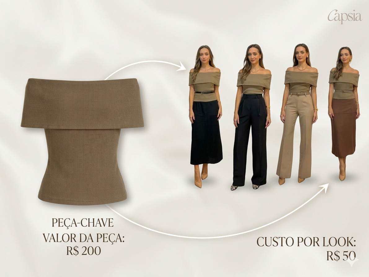 Diferente da moda convencional, onde compramos itens soltos que muitas vezes não combinam entre si, a Capsia foi projetada como um quebra-cabeça perfeito. Ao adquirir as Cápsula da Capsia, você não está apenas comprando 12 roupas, mas sim destravando um algoritmo de estilo. É a matemática da moda: 12 peças que se multiplicam matematicamente em 120 looks (Cápsula Essential). É o fim das compras por impulso e o início de um guarda-roupa onde tudo, absolutamente tudo, funciona entre si.